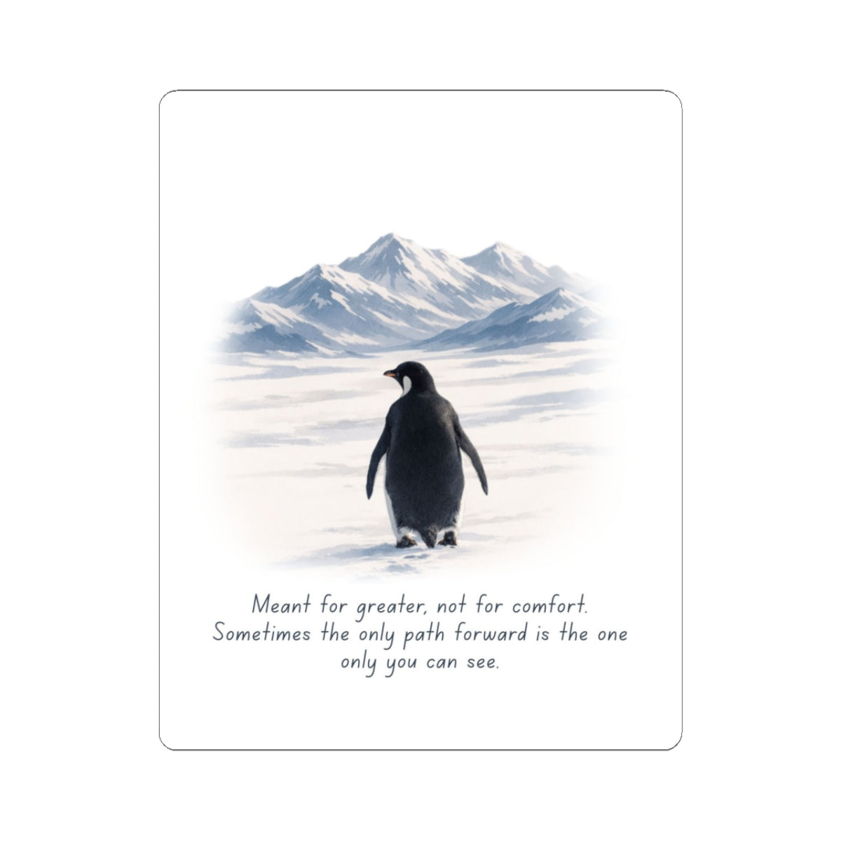Penguin Mountain Inspirational Kiss-Cut Sticker — "Meant for greater, not for comfort"